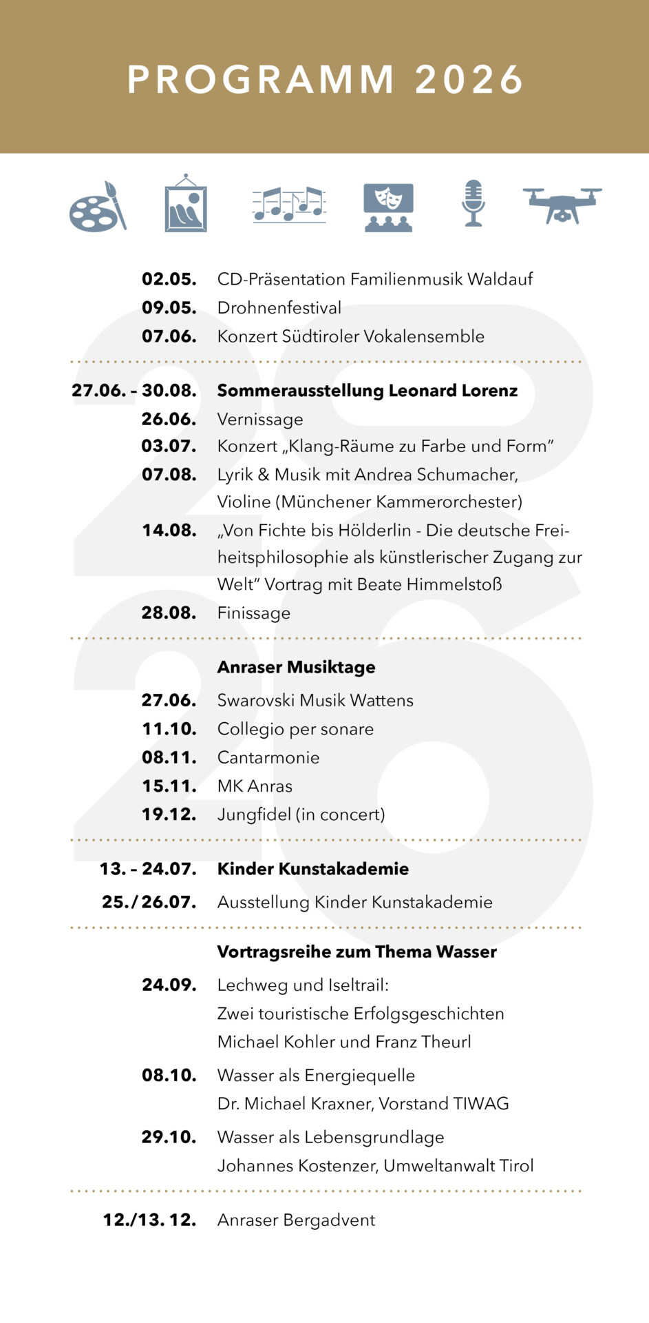 Die große Herausforderung von KULTUR AUS DEM PFLEGHAUS ist es, nach der gelungenen Renovierung des Anraser Pfleghauses dessen historische Räume mit Leben zu füllen, sie adäquat auszustatten und ein Programm zu entwickeln und zu finanzieren. Das Pfleghaus soll ein Ort der Begegnung werden, an dem sich die Menschen über Grenzen hinweg treffen und austauschen. Das Nutzungskonzept sieht drei Schwerpunkte vor: Museale Ausstellungen in den Sommermonaten, kulturelle Veranstaltungen sowie Veranstaltungen von öffentlichem Interesse.